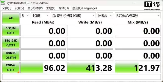 在原版 CDM 中可以调出该项测试组合,最终测出铠侠 VC10 1TB 版本固态硬盘的七读三写成绩为 121MB/s,这个成绩毫无疑问地优秀,即使在 50% 填盘的情况下进行复测,成绩和空盘状态下也是完全一致,再次展现出其不错的稳定性。