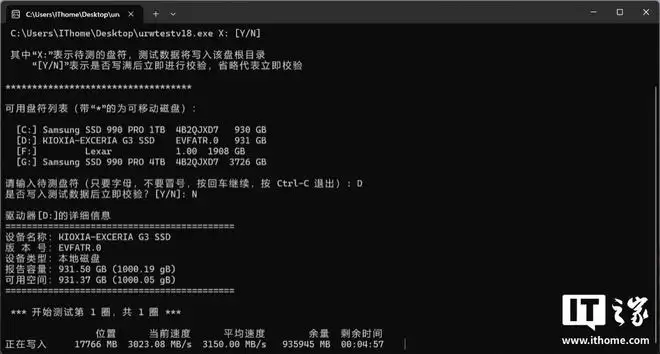 这次我们直接使用 urwtest 软件进行全盘写入测试,通过最后一行的实时写入数据上看,铠侠 VC10 固态硬盘 1TB 版本的初始阶段真实写入速度为 3000MB/s 左右,平均速度达到了 3150MB/s。