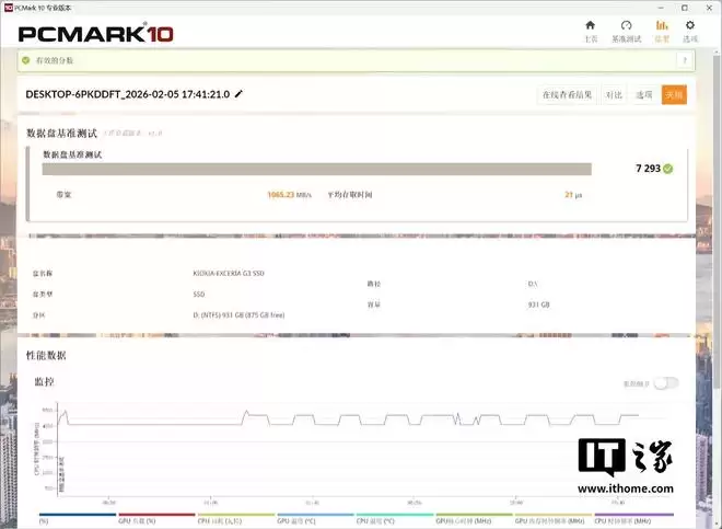 我们通过 PC Mark 10 测试了铠侠 VC10 固态硬盘分别作为数据盘和系统盘的表现。在数据盘测试项目下,铠侠 VC10 固态硬盘 1TB 版本的综合成绩为 7293 分,其带宽速度达到了 1065MB/s,平均存取时间为 21us,这个成绩甚至比我们测过的几块 PCIe5.0 4TB 旗舰固态硬盘还要高。