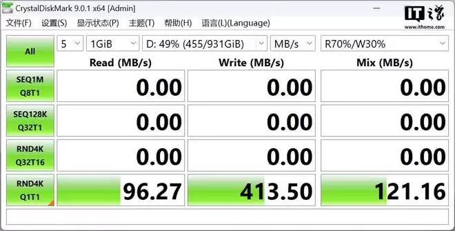 七读三写指的是 Q1T1 下以 4096 字节进行的七分读取与三分写入的混合读写测试。通常来说当你从硬盘中启动软件或者打开游戏加载、地图加载时,绝大多数使用的还是 4KiB 左右的超小文件,既有读取又有写入,读取操作占比更多,且硬盘的两种工作状态同时进行,所以这项测试非常贴合消费者的日常使用场景。