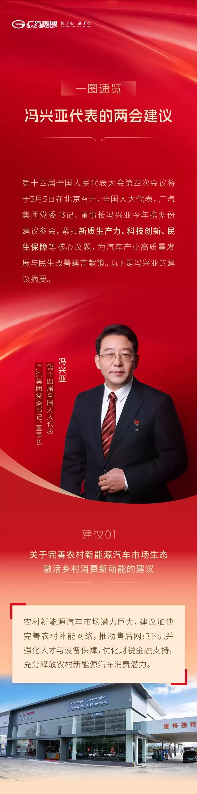 IT之家 3 月 4 日消息,据广汽集团官微,全国人大代表,广汽集团党委书记、董事长冯兴亚今年携多份建议赴京,围绕新质生产力、科技创新、民生保障等核心议题,为汽车产业高质量发展与社会民生改善建言献策