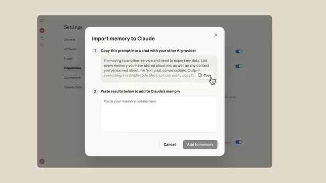 据IT之家观察,这项功能操作起来十分简便:Anthropic已经为从其他平台导出“记忆”准备了提示词模板,用户只需将其他AI服务生成的“记忆”内容粘贴到Claude管理面板的指定位置即可完成操作。