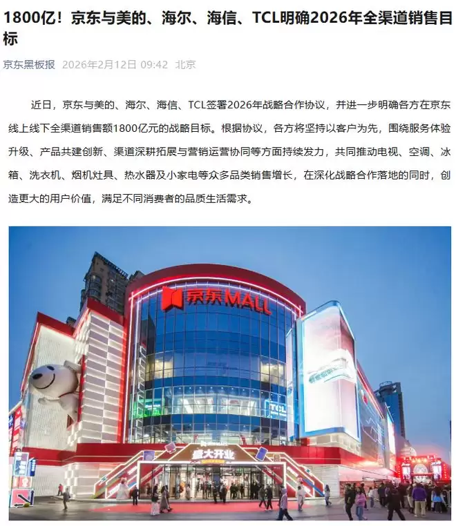 IT之家2月12日消息,据京东黑板报公众号披露,近日,京东与美的、海尔、海信、TCL正式签署了2026年战略合作协议。协议中进一步明确了各方合作目标:计划通过在京东线上线下全渠道的深耕,实现总销售额1800亿元的战略目标。