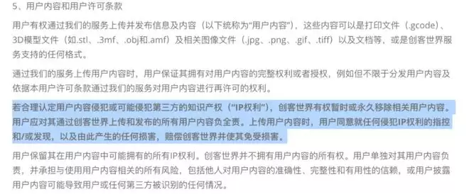 例如拓竹科技在MakerWorld的用户协议中强调若认定用户内容侵犯第三方的IP权利,则其有权移除相关内容,并且要求用户对所上传的内容负责。