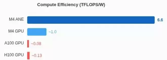 还有一个和功耗有关的例证:前几天有一位工程师 Manjeet Singh 成功实现了对 M4 处理器上「神经引擎」(Neural Engine,简称 ANE)的逆向工程,发现 ANE 的功耗效率极高:算力跑满时的效率高达 6.6 TOPS/W。
