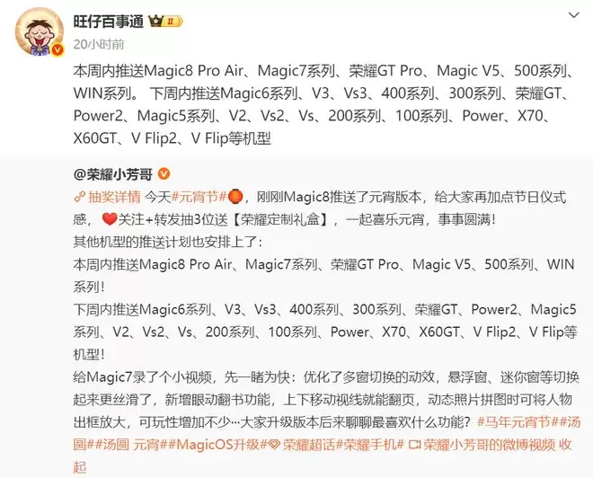 元宵节的汤圆还没消化完,荣耀就给用户端上来一道硬菜,近期荣耀小芳哥在微博上官宣了Magic8系列的元宵版本更新,顺便甩出了一份长长的推送计划表。