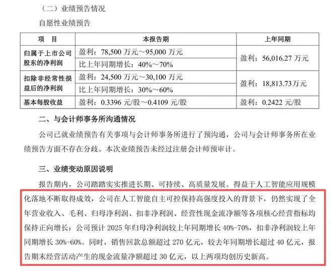 科大讯飞之前发的业绩预告很提气:归母净利润预计7.85亿到9.5亿,同比增长40%–70%;扣非净利润2.45亿到3.01亿,增长30%–60%。