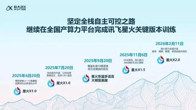 从2024年跟华为一起发布全国产万卡算力平台“飞星一号”,为自主训练打下地基;到2024年星火4.0 Turbo在中文能力上全面超越GPT-4 Turbo;再到2025年11月,星火X1.5攻克国产算力训练的两座大山,MoE架构实现突破;2026年2月,星火X2发布,一步一个脚印,一步也没落下。