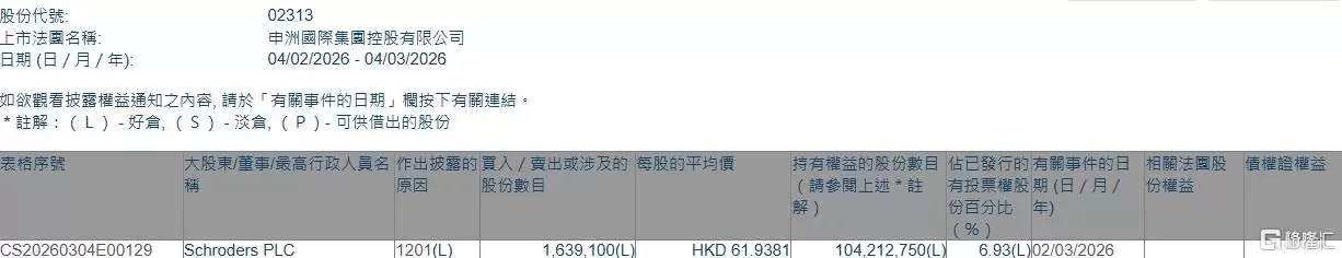 根据联交所最新公布的权益披露资料,2026年3月2日,神州国际(02313.HK)在场内遭遇施罗德公共有限公司减持。此次减持均价为每股61.9381港元,涉及股份数量约为163.91万股,总金额约1.02亿港元。