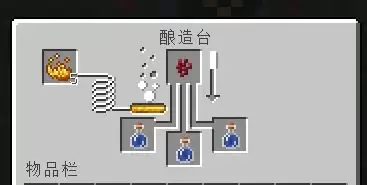 第一步,在酿造台顶部的槽位放入烈焰粉作为燃料。接着,在下方的三个格子中放入装满水的玻璃瓶,并在最上方的材料槽放入一个地狱疣,开始第一次酿造。