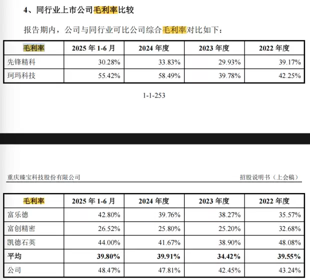 2024年至2025年上半年,臻宝科技综合毛利率分别为43.24%、42.45%、47.81%和48.47%。其中,半导体行业产品毛利率在报告期内分别为50.80%、54.07%、56.57%和54.24%,显著高于同行平均水平。显示面板行业产品毛利率分别为32.88%、22.92%、25.04%和25.57%。