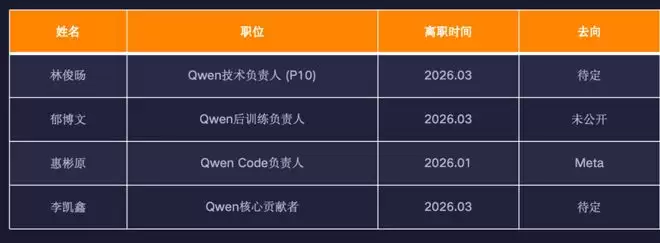 林俊旸离职推文发布不久,Qwen Code负责人惠彬原等多位初创团队骨干也相继传出离职或转岗的消息。