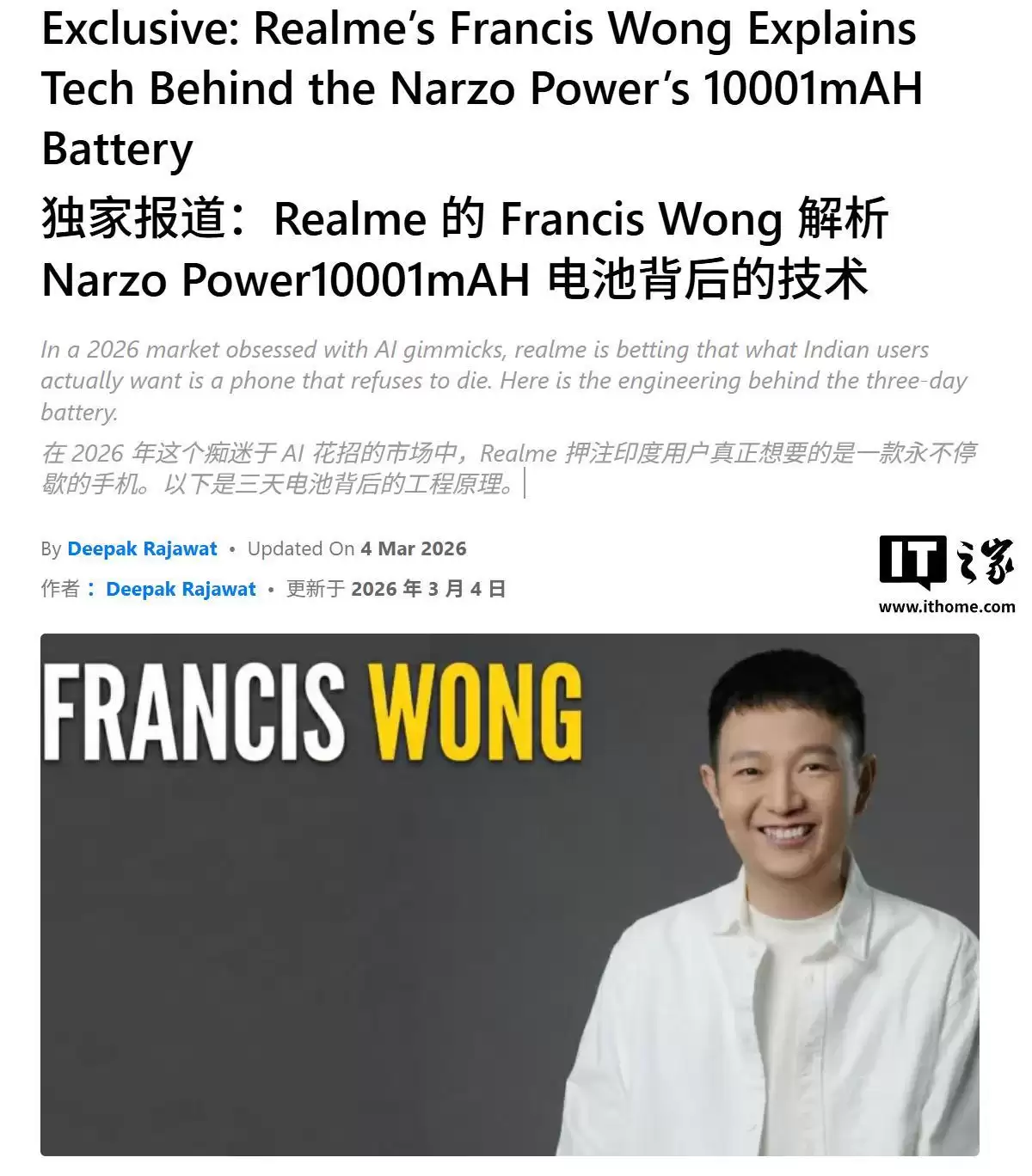 据IT之家3月5日消息,realme品牌营销总监王硕(Francis Wong)日前在接受科技媒体smartprix专访时,首次对外揭秘了Narzo Power 5G手机所采用的10001mAh电池核心技术。