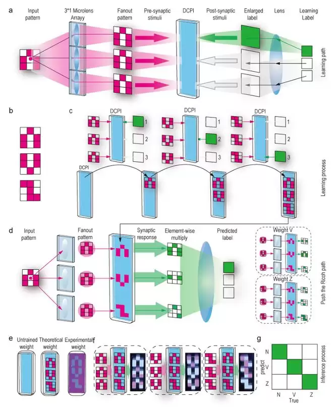 在训练阶段,研究人员将字母 N、V、Z 的形状作为紫外光图案投射到树脂基底上,并紧接着用绿光投射对应的结果图案。训练完成后,再照 N 的紫外光,对应的结果区域就会发绿光,成功认出 N。V、Z 同理,实验完全成功。