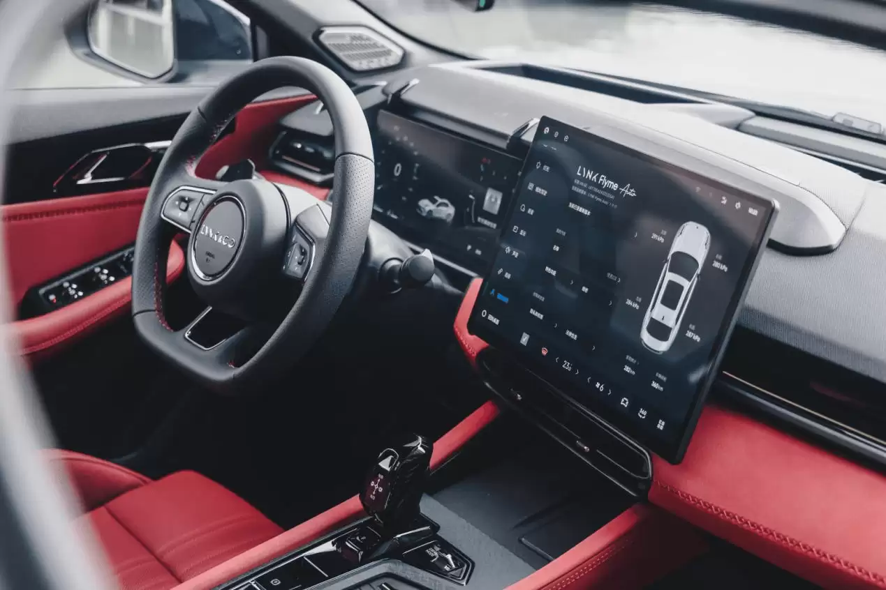 内饰采用“炽热红”运动主题设计,座椅与中控区域覆盖高饱和度红色材质,营造出强烈的驾驶氛围。智能座舱搭载LYNK Flyme Auto系统,配备“龙鹰一号”芯片与16G+128G存储组合,支持12.3英寸液晶仪表主题随驾驶模式切换。音响系统采用14扬声器7.1环绕布局,总功率达1000W,提供沉浸式听觉体验。