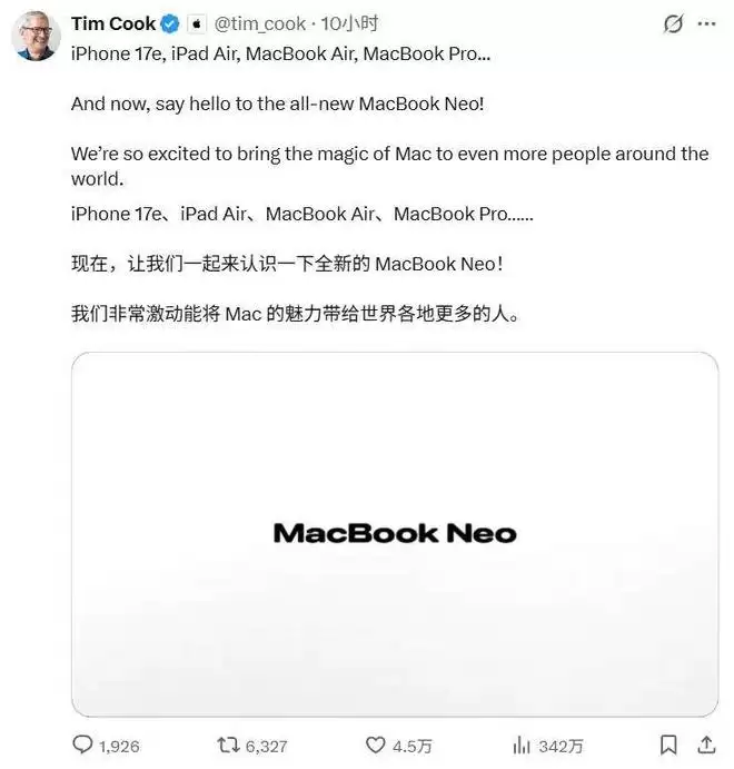 一方面,它确实是一个典型的科技命名:Neo = New,意味着一次新的开始。放在 Mac 产品线上,也颇有象征意味,这是苹果第一次真正把 MacBook 的价格打到主流消费级区间,像是为 Mac 开了一条新的支线。