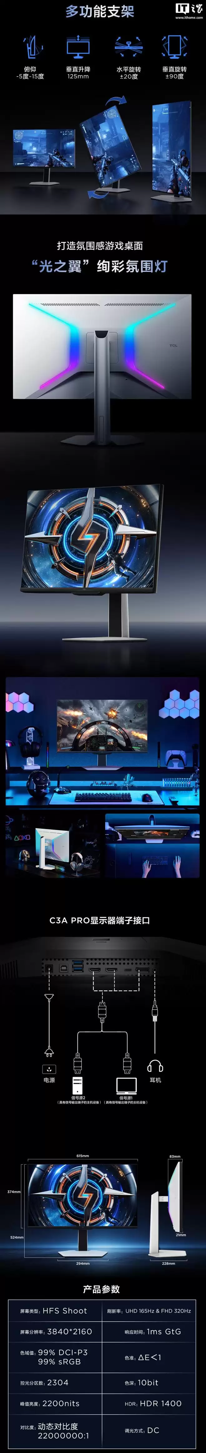 根据IT之家从商品页面获取的信息,TCL 27C3A Pro支持4K 165Hz和1080P 320Hz双模式切换,全屏峰值亮度可达1400尼特;显示器配备了可旋转升降俯仰的支架,背部还设计了氛围灯。