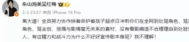 吴红梅也在前两天回应了这件事,称全组人员都在护着这部剧,结果粉丝却一直在骂主创和角色。