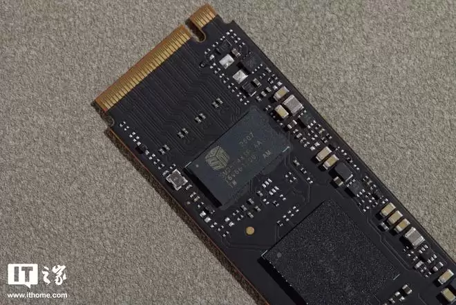 细节上,靠近M.2金手指接口一侧的核心元件为固态硬盘主控芯片。芯片表面的微距实拍丝印显示型号为SM2504XT,这是来自慧荣科技的新一代PCIe 5.0主控。