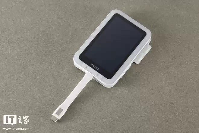 打开包装,Insta360 Snap本体便映入眼帘,正面是一块3.5英寸触控屏,周围环绕一圈补光灯;下方自带一条USB-C接口连接线;侧边还有两个物理按键,分别为电源键、镜像键。