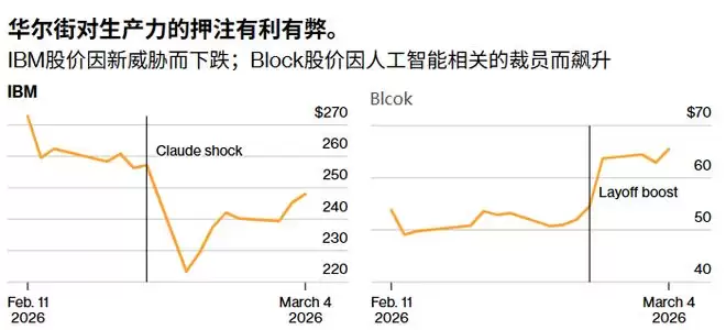 但上周也出现了一个例子,说明生产力提升也可能给投资者带来负面影响——这其中就包括历史悠久的IBM。初创公司Anthropic声称,其人工智能工具可以完成一项过去需要“大量顾问”才能完成的任务:对运行在IBM计算机上的过时编程语言Cobol进行现代化改造。IBM股价因此创下25年来最大跌幅,之后才收复了大部分失地。