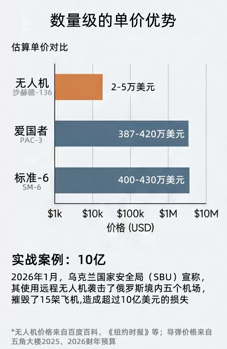 第一,极致的成本效益比。以伊朗的“沙赫德-136”无人机为例,其单架成本仅为2至5万美元;而一套用于拦截它的美制“爱国者”防空导弹系统,价格却高达400万美元。这种1:200的成本差距,使得防御方实际上陷入了“拦截即破产”的经济困境。