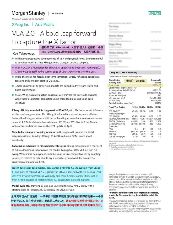 资本市场的反应更直接,摩根士丹利、美国银行、汇丰银行同步给出「买入」评级,摩根士丹利的研究报告中指出:「小鹏第二代VLA的落地,使其具备与特斯拉在全球市场直接竞争的能力,全球智能汽车产业的格局或迎来新的变量。」