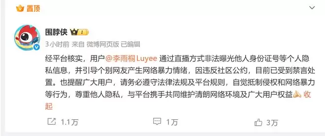3月5日晚间,@围脖侠发布公告称,经平台核实,用户@李雨桐Luyee通过直播方式非法曝光他人身份证号等个人隐私信息,并引导个别网友产生网络暴力情绪,因违反社区公约,目前已受到禁言处置。