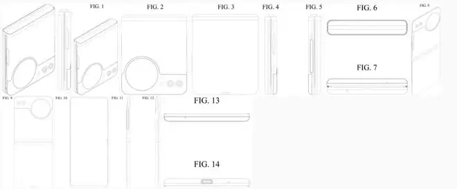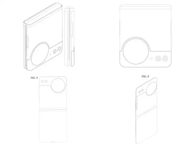 据介绍,这套专利从多个角度展示了这款小折叠手机,整体上依然采用类似Galaxy Z Flip系列的翻盖式折叠结构,最大的变化在于机身后盖配备了一个小型圆形开孔,可能是副屏区域。