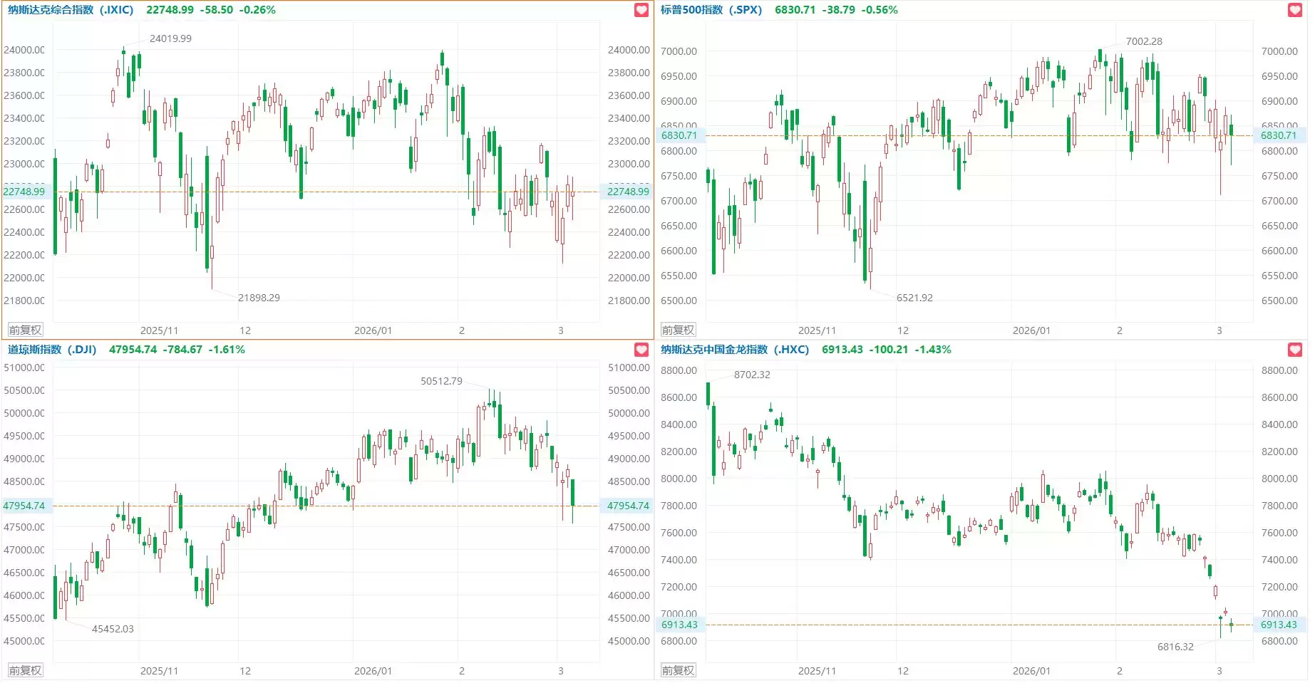 北京时间3月7日凌晨,美股三大股指集体收跌,道琼斯指数下跌1.61%,标普500指数下跌0.57%,纳斯达克指数下跌0.26%。大型科技股表现分化,微软上涨超过1%,英伟达、奈飞、亚马逊、英特尔小幅上扬;与此同时,Meta跌幅超过1%,苹果、特斯拉、谷歌股价则出现小幅下滑。