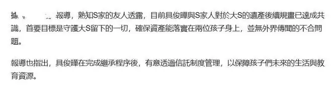 媒体:具俊晔希望最终的受益人是大S的子女,他说服S家人,全家保持理念一致,为孩子着想。