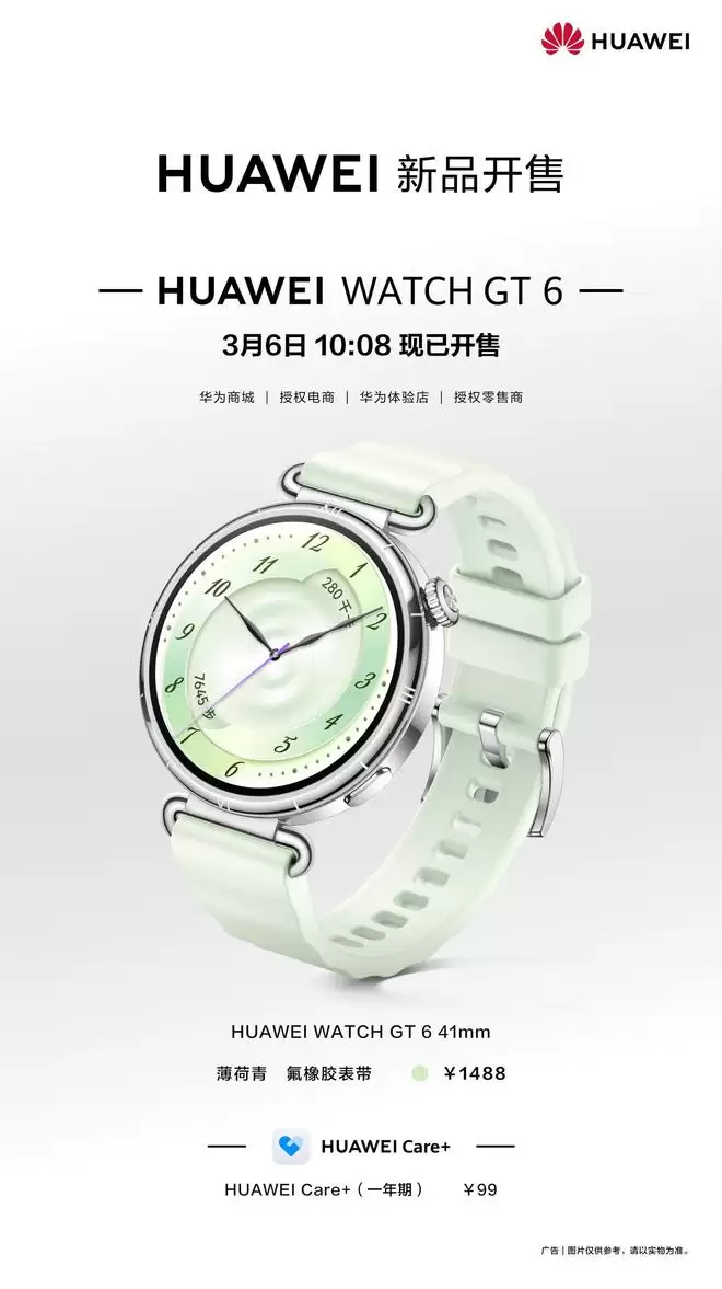 3月6日消息,华为今日正式为HUAWEI WATCH GT 6推出全新"薄荷青"配色。这款智能手表将于今日上午10点08分准时开售,标配氟橡胶表带,首发尝鲜价为1488元。