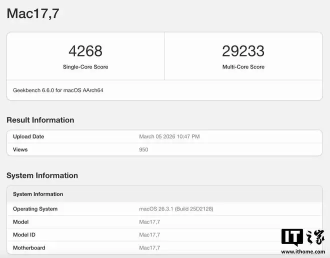 据IT之家3月6日消息,搭载M5 Max芯片的16英寸MacBook Pro日前现身Geekbench跑分数据库,结果显示苹果再次刷新了性能记录。