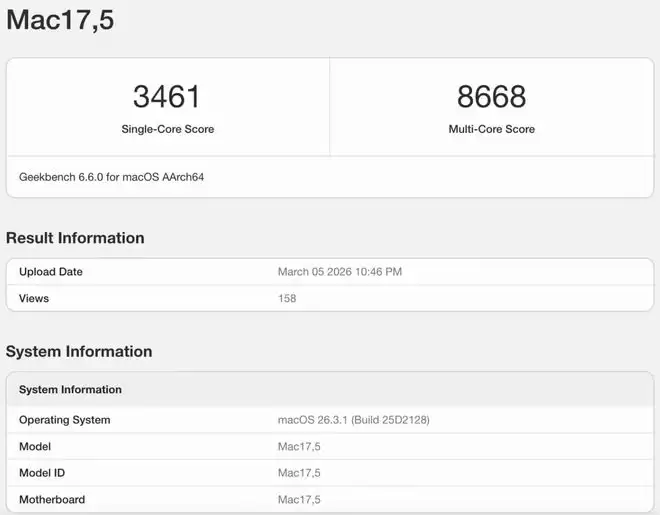 【环球网科技综合报道】3月6日,备受关注的苹果MacBook Neo笔记本Geekbench跑分测试结果正式曝光。这款产品搭载了与iPhone 16 Pro同款的A18 Pro芯片,其CPU性能表现与iPhone 16 Pro基本持平,单核性能尤为出色,多核性能甚至略微超越了M1芯片。这样的性能表现,使其精准定位于满足日常轻办公的使用需求。