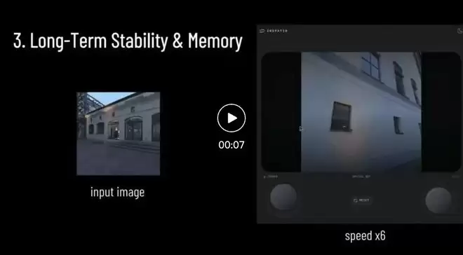 得益于 3D 的模型机制,其生成的虚拟世界有高度的一致性,模型生成的场景在空间几何与光照与物理规律上非常稳定,无限时长推理不会出现遗忘和衰退。