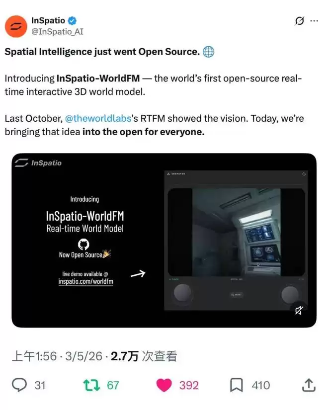 随着 InSpatio-WorldFM 等开源空间智能模型的推出,生成模型、具身智能体和现实世界的机器人现在站在了全新的起跑线上。