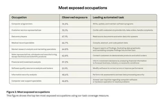 程序员的日常工作中,已有约75%的任务可以被Claude覆盖!紧随其后的,是客服代表(70%)、数据录入员(67%) 等岗位。