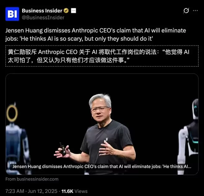 Amodei的警示甚至引来英伟达CEO黄仁勋的驳斥: