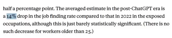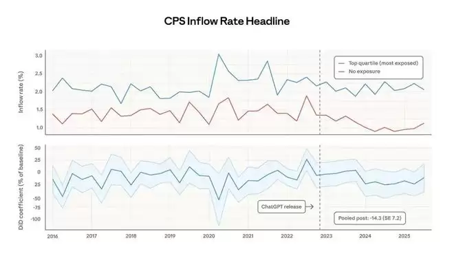 可另一个信号更危险:22-25岁的年轻人,在高暴露岗位的入职率直接掉了14%。老员工还能靠经验苟住,新人连门都摸不到了。