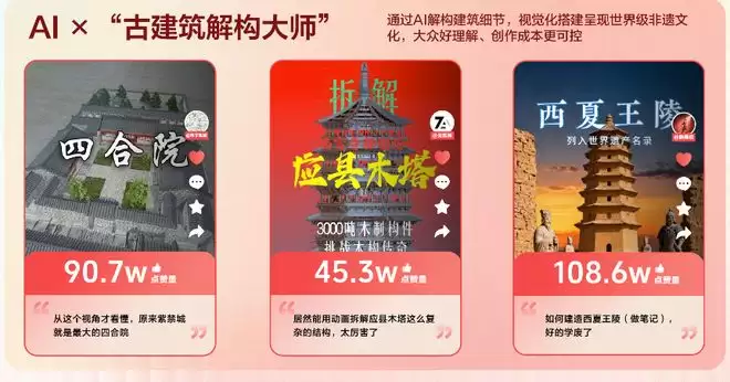 报告指出,2025年,平台上AI类非遗视频作品增长超10倍。AI技术的深度应用,正在助力传统文化实现“破圈”传播。抖音上的创作者们利用AI解析应县木塔的结构、复原世界遗产西夏王陵的建造过程,科普干支纪年法、玲珑瓷工艺。通过特效合成与虚拟场景构建,原本抽象的历史知识与复杂技艺变得更直观,让网友沉浸式体验感受中华文化的博大精深。一位网友在评论区留言:“看完视频,我的简历又新增一项技能。”
