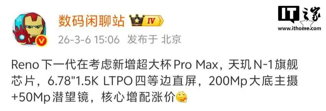 IT之家3月6日快讯,数码闲聊站博主今日爆料称,OPPO Reno系列下一代或将新增超大杯Pro Max版本。新机将搭载天玑N-1旗舰芯片,配备6.78英寸1.5K LTPO四边直屏,采用200Mp大底主摄与50Mp潜望镜组合,核心配置升级的同时价格也将有所调整。