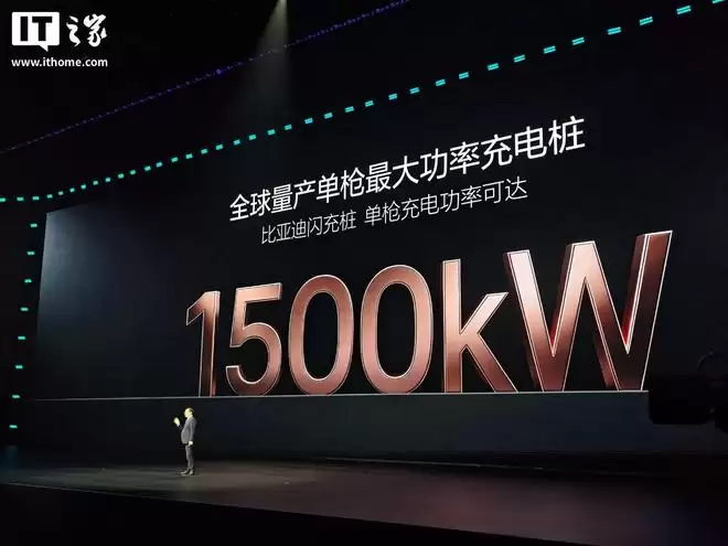 在昨晚的发布会上,比亚迪正式发布了全球量产单枪最大功率充电桩——比亚迪闪充桩,其单枪充电功率可达1500千瓦。