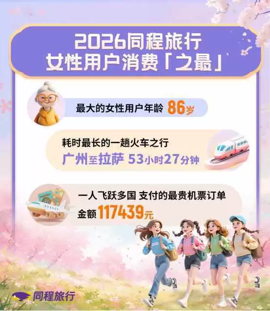 最大女性用户年龄达86岁、耗时最长的一趟火车从广州至拉萨、一人飞跃多国,机票订单金额最高超11万元 3月6日,同程旅行发布《2026女性旅行消费报告》,透过一组组数字见证近一年来女性用户旅