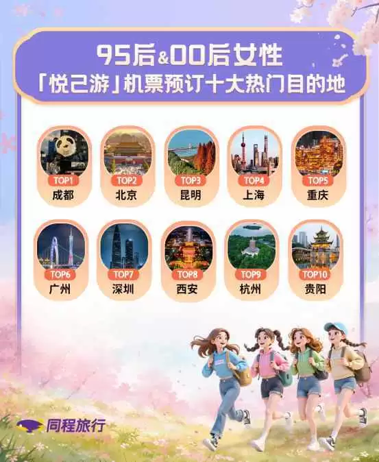 当“爱你老己”式的悦己游成为一种流行趋势,95后和00后女性早已把取悦自己变成一种生活方式。同程旅行平台上,95后和00后女性是“周末微度假”的主力客群,平均每三个星期就会来一场“去班味”之旅。至于出逃到哪里?同程旅行数据显示,从机票预订热度来看,95后和00后女性最爱去的国内城市前10名依次是成都、北京、昆明、上海、重庆、广州、深圳、西安、杭州、贵阳。
