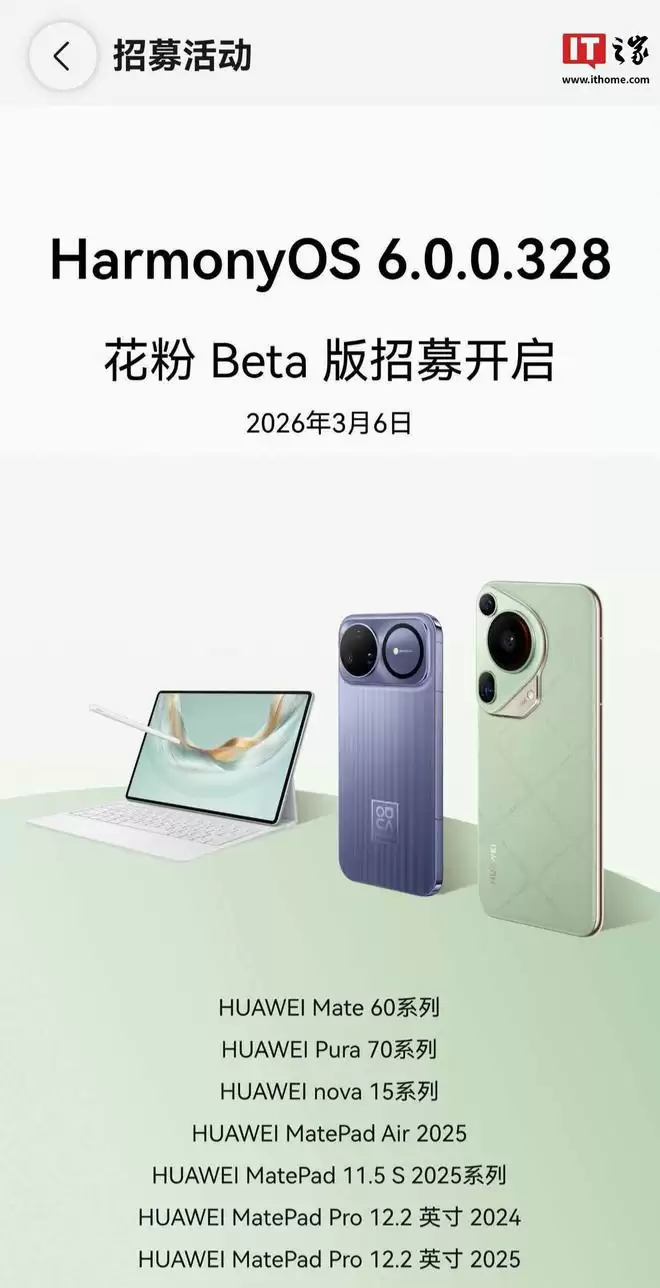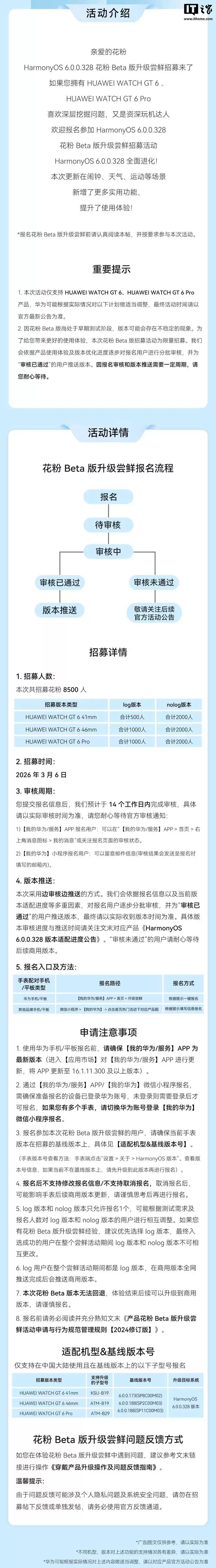IT之家3月6日消息,华为HarmonyOS学生代表团队今日正式宣布,HUAWEI WATCH GT 6系列现已启动HarmonyOS 6花粉Beta版升级尝鲜招募活动。