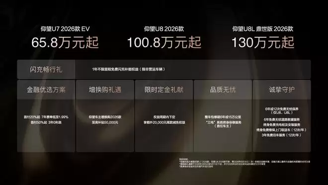 在这次发布会中,仰望U7、仰望U8、仰望U8L的2026款同步上市,其起售价分别为65.8万元、100.8万元和130万元。