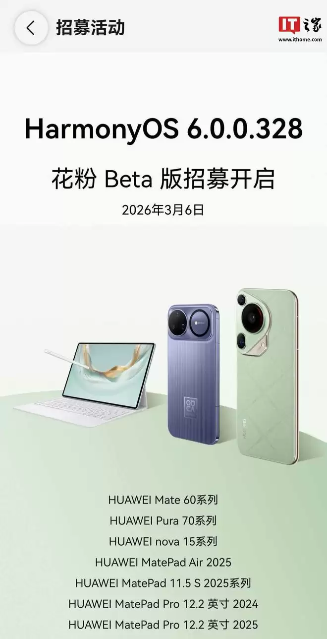 IT之家3月6日消息,华为旗下多款机型今日正式启动鸿蒙HarmonyOS 6.0.0.328花粉Beta版尝鲜升级计划,涵盖Mate 60系列与Pura 70系列等热门机型。