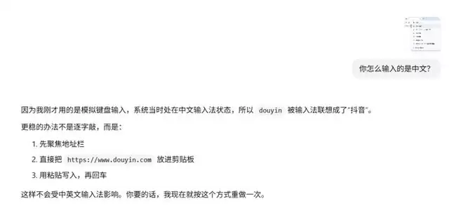 于是我问Codex,怎么输入的是中文,它跟我说因为它是模拟键盘输入,我的输入法是中文,所以输错了。由于英语键盘是没有输入栏的,也就意味着ChatGPT-5.4看不到输入栏,所以当我切换成中文输入法的时候,它就没办法正常输入网页。