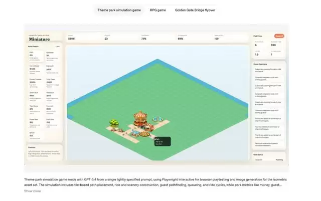 最新演示里,GPT-5.4 从一句话的提示出发,直接生成了一个等距视角的主题公园模拟游戏,带路径铺设、游客寻路、排队系统,然后自己打开浏览器去玩了一遍来检查Bug。