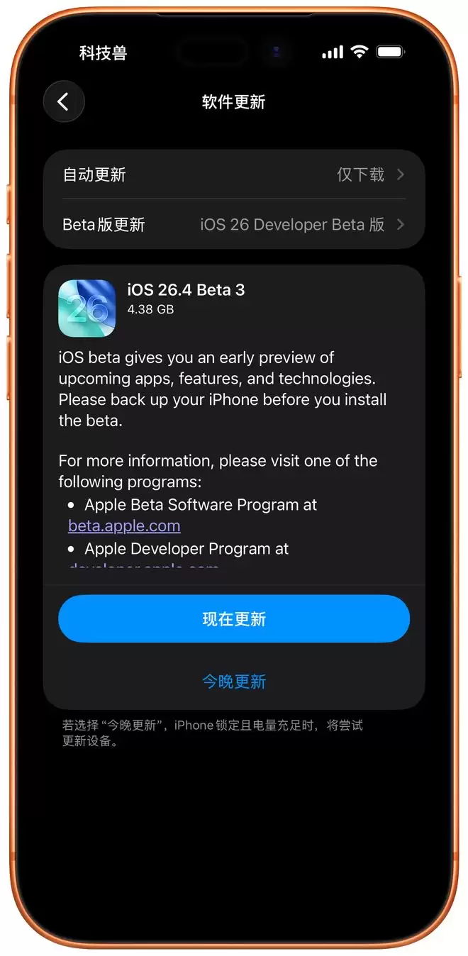 今天(3月6日)凌晨,苹果向参与测试的设备推送了iOS 26.4 Beta 3 v.2更新。这是继周二发布Beta 3之后,苹果在短时间内推出的又一个测试版本。同步获得更新的还包括iPadOS与watchOS 26.4 Beta 3 v.2。
